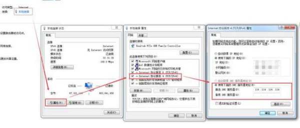 点击计算机右下角右键网络图标:打开网络和共享中心-本地连接-属性-IP4协议。