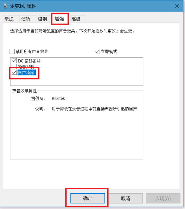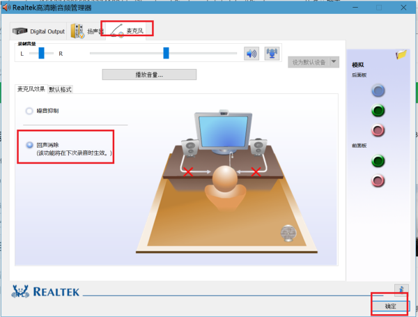 打开按面板——硬件和声音——Realtek高清晰音频——麦克风——选中“回声消除”——确定。