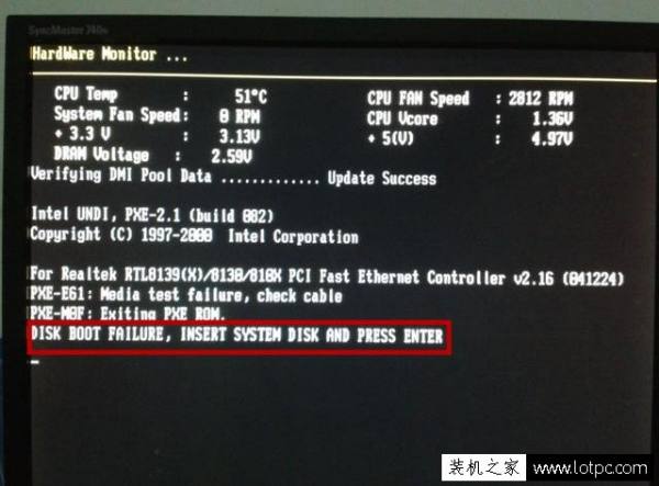 当后面出现英文disk boot failure,insert system disk and press enter 。这样的英文时,基本是系统问题,重新安装系统即可,如果安装系统不行就重新分区再安装系统,还不行就用MHDD硬盘工具检测硬盘是否有坏道。