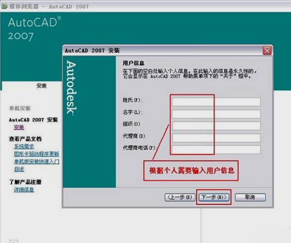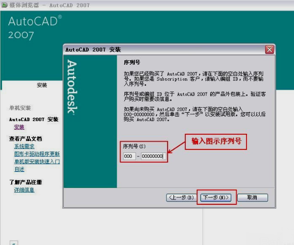5、然后在接下来出现的窗口中输入序列号,然后点击下一步。如果未够买CAD软件,需要全部输入为0。