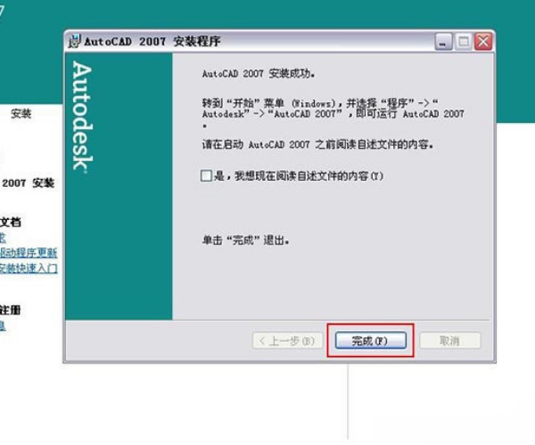 11、等待软件安装完成,在最后出现的页面中点击“完成”按钮即可。完成以上设置后,即可完成CAD2007的安装。