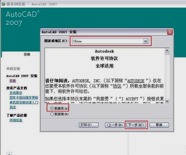 4、在出现的窗口中地区默认选china,选择“我接受”选项,然后点击下一步继续。