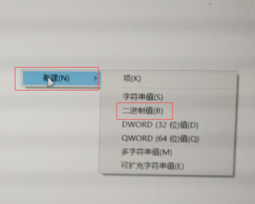 3、在右侧窗口中点击右键,选择新建—二进制值。