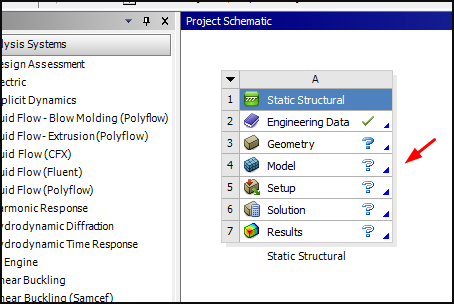 3、然后拖动所需分析类型到模型(图中Geometry),模型变红时松开鼠标;出现分析选框,双击model选项,进入分析界面。