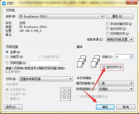 第二步,在打印设置里边的份数下方,勾选逐份打印,点击确定即可实现逐份打印。