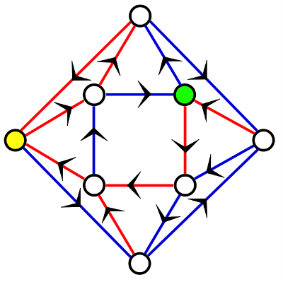 举个例子。在维基网给出的图例中,如果按图中所示方式将16条边着色,那么不管你从哪里出发,按照“蓝红红蓝红红蓝红红”的路线走9步,你最后一定达到黄色顶点。路线着色定理就是说在满足一定条件的有向图中,这样的着色方式一定存在。严格的数学描述如下。我们首先来定义同步着色。G是一个有限有向图并且G的每个顶点的出度都是k。G的一个同步着色满足以下两个条件:1)G的每个顶点有且只有一条出边被染成了1到k之间的某种颜色;2)G的每个顶点都对应一种走法,不管你从哪里出发,按该走法走,最后都结束在该顶点。有向图G存在同步着色的必要条件是G是强连通而且是非周期的。一个有向图是非周期的是指该图中包含的所有环的长度没有大于1的公约数。路线着色定理这两个条件(强连通和是非周期)也是充分的。也就是说,有向图G存在同步着色当且仅当G是强连通而且是非周期的。