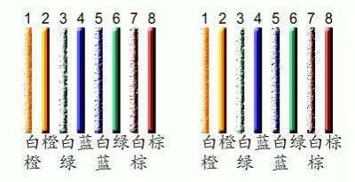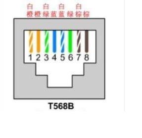 T568B的排列方法:白橙 | 橙 | 白绿 | 蓝 | 白蓝 | 绿 | 白棕 | 棕