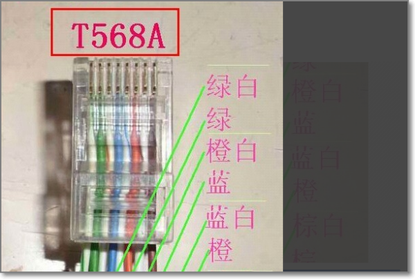 T568A的排列方法:白绿 | 绿 | 白橙 | 蓝 | 白蓝 | 橙 | 白棕 | 棕