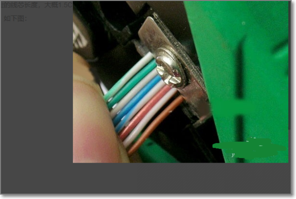 3、将排序好的8种颜色芯线并排放到压线钳切刀处,8根线同一平面上并拢且尽弄直,留下一定的线芯长度,大概1.5CM处用压线钳剪齐。如下图: