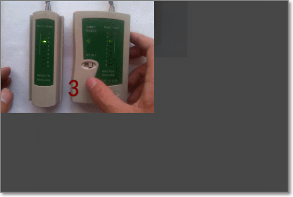 6、按以上步骤,一头网线就做好了,用相同步骤做别一头,两头都做好后,把网线的两头分别插到测试仪上并打开测试仪开关测试指示灯亮起来。如果正常网线,两排的指示灯都是同步亮的,如果有此灯没同步亮,证明该线芯连接有问题,应重新制作。如下图: