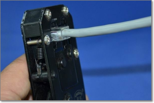 5、把插在压线钳中的网张用力压紧水晶头,抽出即可。如下图: