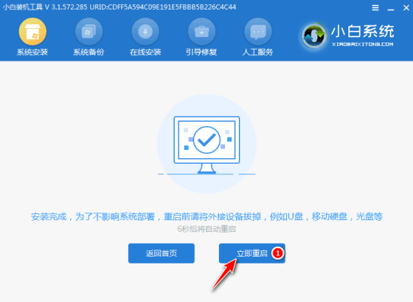 5、进入pe系统后我们等待小白装机工具来帮助我们安装即可,等待出现安装完成界面我们拔出u盘,点击立即重启。