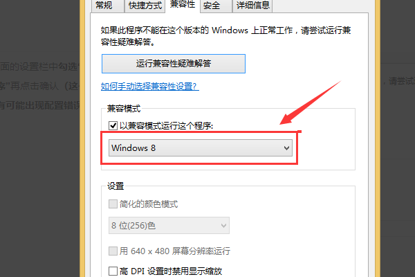 3、然后在弹出的对话框里,选择“兼容性”选项卡,在兼容模式下勾选,然后选择Window 8模式。