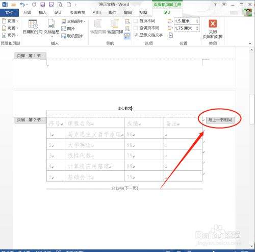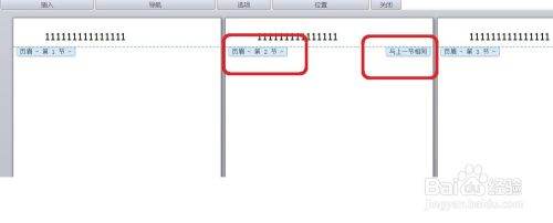 然后双击页眉,页面就出现了变化,如下图红色圈出位置,有了上一节显示。这样就说明分节成功了,然后继续。
