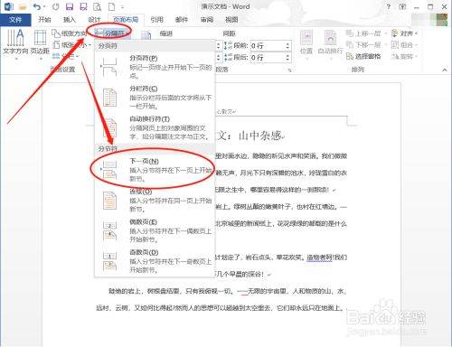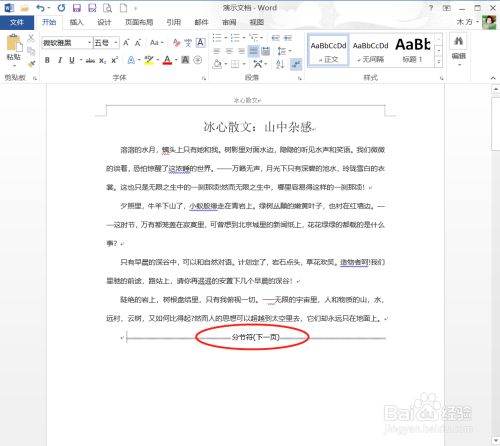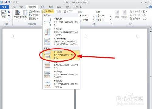 在下拉菜单中选择单击“下一页”,在第一页末尾会出现一个分节符号