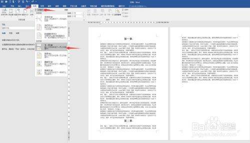 光标置于“第二章”之前,点击“布局”下“分隔符”中的“下一页”。