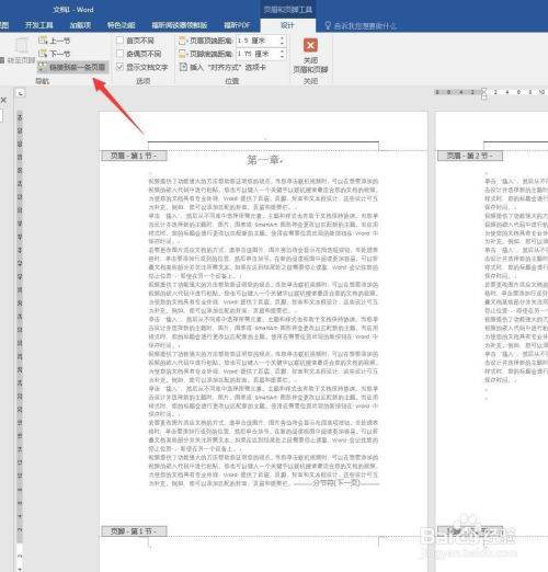 点击第二页的页眉,然后在工具栏中找到链接到前一条,如下图所示,将其取消选择。就是不链接到前一条页眉。第三页也是相同的操作。