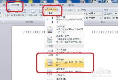 然后将光标移动到第一页的最后,在工具栏中选择,页面布局——分隔符——连续。再将光标移动到第二也最后,进行同样的操作。如下图所示