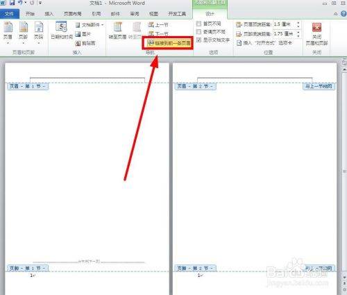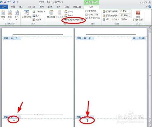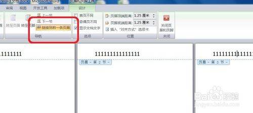 现在我们双击第二页的页脚,进入页脚编辑状态,在菜单栏“导航”选项组中,“连接到前一条页眉”选项呈现黄色,表示已经被选中。我们单击该选项,不选该功能