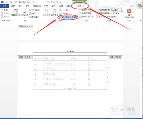 5、如果“链接到前一条页眉”是黄色的,就单击