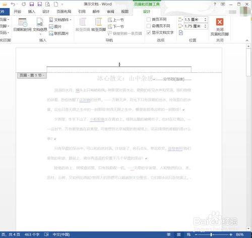 插入页眉页脚后,如下图,输入其中一个页眉的文字内容。