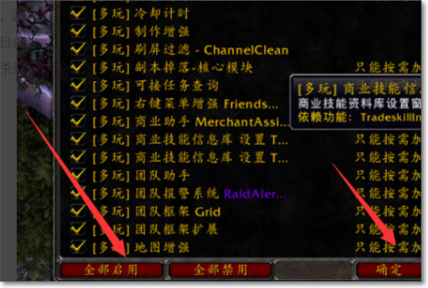 4、加载完所以可以插件之后点击下方的全部启用,然后点击确定。游戏会重新加载全部的插件信息,其中就包含伤害相关的插件。