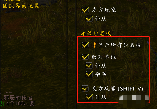 3、将单位姓名板下的6个选项都勾选上,并点击确定。这时候自己人物的头上就显示血条了。