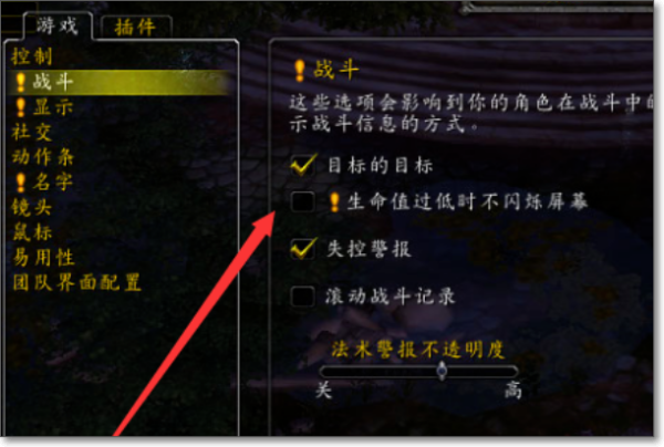 2、在老版本中在该界面就可以设置战斗的相关信息,但是现在的版本只能设置目标的目标以及生命值过低时候是否闪烁屏幕等信息,并不能对伤害数值进行设置。