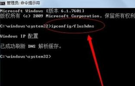 2、进入命令提示符界面,输入ipconfig/flushdns命令进午DNS重置。