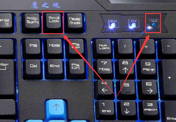四、ScrollLock指示灯:点击键盘上的ScrollLock键即可开启该指示灯,它是滚动锁定键。基本上使用电脑时很少用到该键。只在一些特定的程序使用,如Excel中,当该灯熄灭时,我们按键盘上的方向键,会将光标移至下一个单元格中;但当该标示灯按亮后,按键盘上的方向键,会锁定光标而滚动页面。