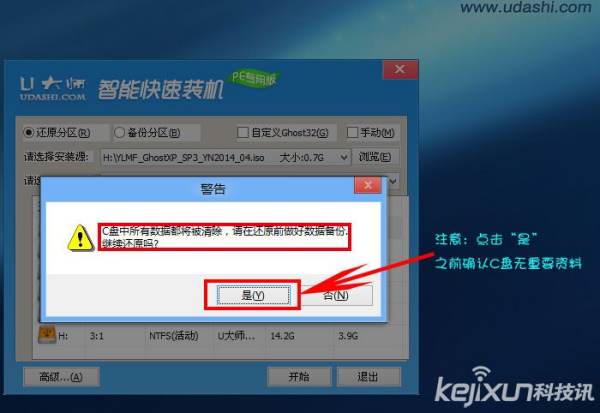 2、点击开始后,会弹出一个警告,意思是:“C盘中所有数据都将被清除,请在还原前做好数据备份,继续还原吗?”这里读者朋友一定要三思而后行,确认清楚后C盘中已经没有什么重要的数据了,然后点--是。
