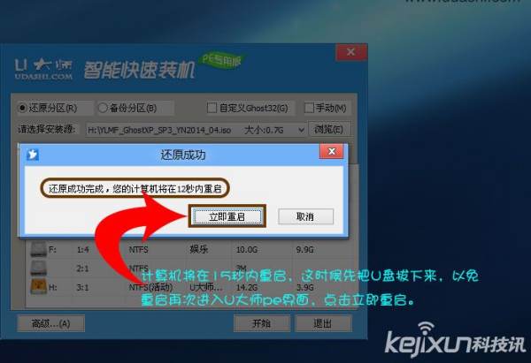 4、等到滚动条读完后,就会出现一个还原成功提示--还原成功完成,您的计算机将在15秒内重启,这时候先把U盘拔下来,以免重启再次进入U大师pe界面,点击立即重启。