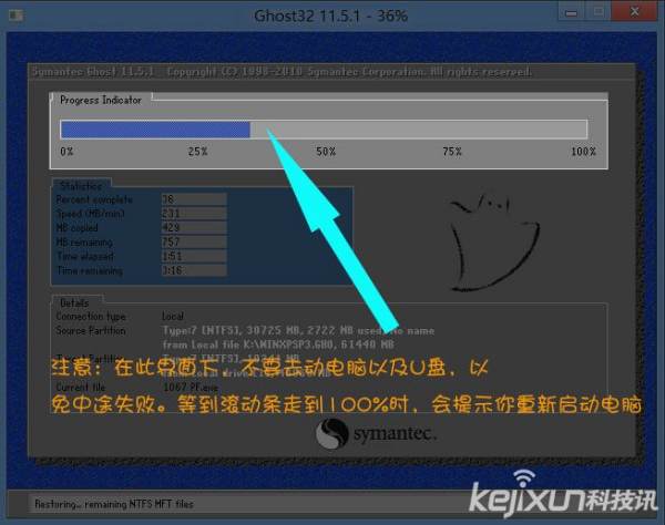 3、点完“是”后,就会出现下图所示界面,这时我们需要注意:在此界面下,不要去动电脑以及U盘,以免中途失败。等到滚动条走到100%时,会提示你重新启动电脑: