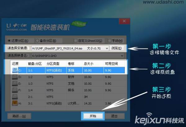 1、进入win8pe后桌面图标会自行跳动三次,U大师快速装机便会自动弹出,如果没有自动弹出,读者可以点击运行桌面上的“U大师一键快速安装”,下图所示是安装ghost版本的系统,首先我们点击浏览,在U盘找到我们下载好的ghost xp的iso或者gho文件,然后看一下C盘的可用空间,安装ghost xp的话小编建议C盘空间30G,然后点一下C盘,点击开始。