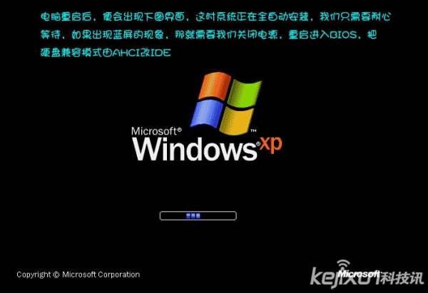 1、电脑重启后,便会出现下图界面,这时系统正在全自动安装,我们只需要耐心等待,如果出现蓝屏的现象,那就需要我们关闭电源,重启进入BIOS,把硬盘兼容模式由AHCI改IDE