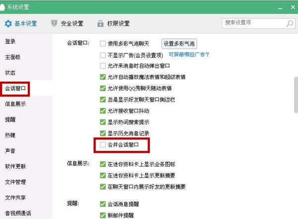 3、弹出的对话框中,点击左侧的“会话窗口”,将“合并会话窗口”的勾选取消即可。
