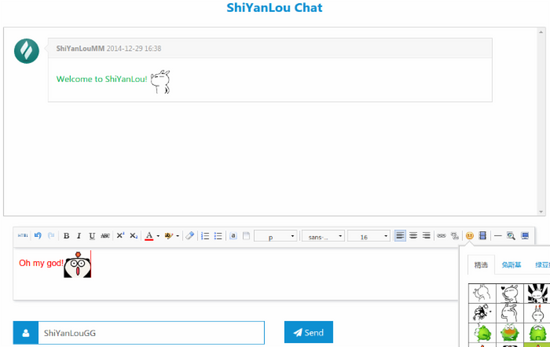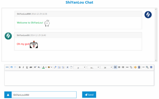 123456789101112131415161718192021222324252627282930313233343536373839404142434445464748495051525354 var um = UM.getEditor('myEditor');$('#nickname')[0].focus();// 新建WebSocket对象,最后的/websocket对应服务器端的@ServerEndpoint("/websocket")var socket = new WebSocket('ws://${pageContext.request.getServerName()}:${pageContext.request.getServerPort()}${pageContext.request.contextPath}/websocket');// 处理服务器端发送的数据socket.onmessage = function(event) {addMessage(event.data);};// 点击Send按钮时的操作$('#send').on('click', function() {var nickname = $('#nickname').val();if (!um.hasContents()) { // 判断消息输入框是否为空// 消息输入框获取焦点um.focus();// 添加抖动效果$('.edui-container').addClass('am-animation-shake');setTimeout("$('.edui-container').removeClass('am-animation-shake')", 1000);} else if (nickname == '') { // 判断昵称框是否为空//昵称框获取焦点$('#nickname')[0].focus();// 添加抖动效果$('#message-input-nickname').addClass('am-animation-shake');setTimeout("$('#message-input-nickname').removeClass('am-animation-shake')", 1000);} else {// 发送消息socket.send(JSON.stringify({content : um.getContent(),nickname : nickname}));// 清空消息输入框um.setContent('');// 消息输入框获取焦点um.focus();}});// 把消息添加到聊天内容中function addMessage(message) {message = JSON.parse(message);var messageItem = '
