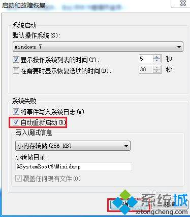 3、进入设置页面,把“自动重新启动”前面的对勾去掉,然后点击确定。