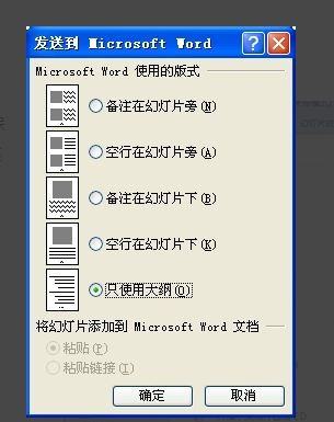 2,然后在“发送到Microsoft Word”选择"只使用大纲"单选按钮并单击"确定"按钮。