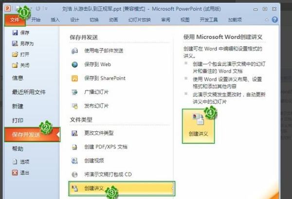 1,打开要转换的PPT幻灯片,单击"文件"→"保存并发送"→找到“文件类型”的"创建讲义"菜单命令→点击右侧的“创建讲义”按钮。