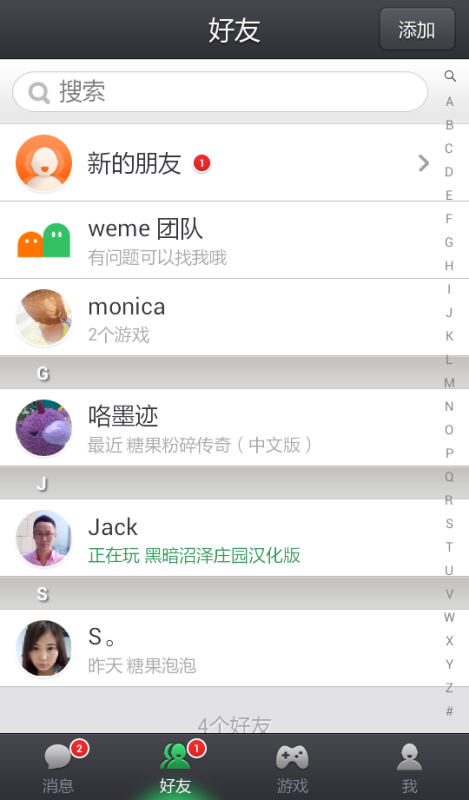 我手机里装了个【weme】,朋友正在玩啥游戏我都能看到,还专门推荐朋友喜欢玩的游戏给我。最近在玩推荐过来的游戏都还不错,比如印第安探险、保卫萝卜神马的。对于玩游戏的孩纸来说,还是蛮方便的,推荐你试试。很多应用市场都可以下载得到。