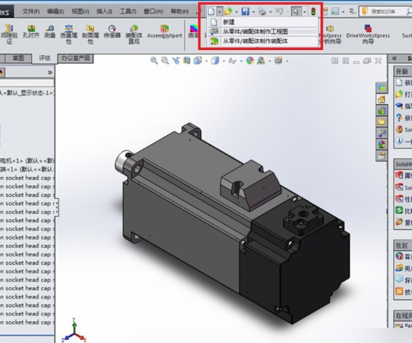 1、在电脑上用SolidWorks软件打开需要转换的三维图形,然后点击菜单栏中的“新建”图标,选择“从零件/装配体制作工程图”选项点击。