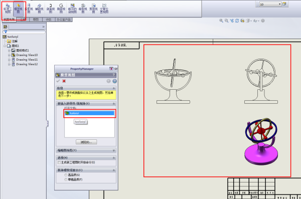 单击视图布局标签,选择标准三视图或模型视图按钮,弹出视图窗口,双击选择该模型文件或点击浏览选择相应的文件,然后拖动鼠标,将模型视图放置在相应的位置上。具体操作如下图所示: