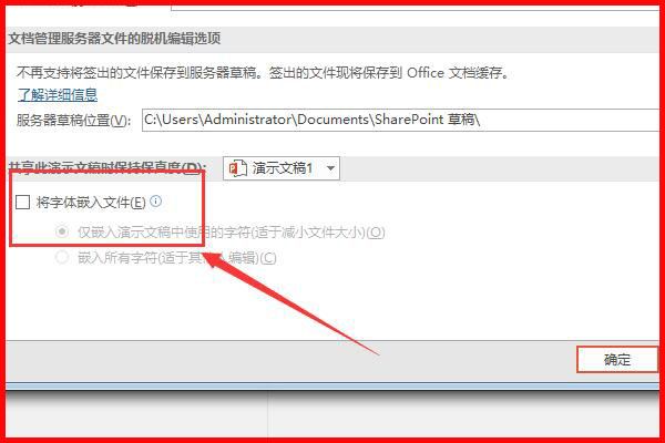 4.选中save选项以将字体嵌入到文件中,如下图。