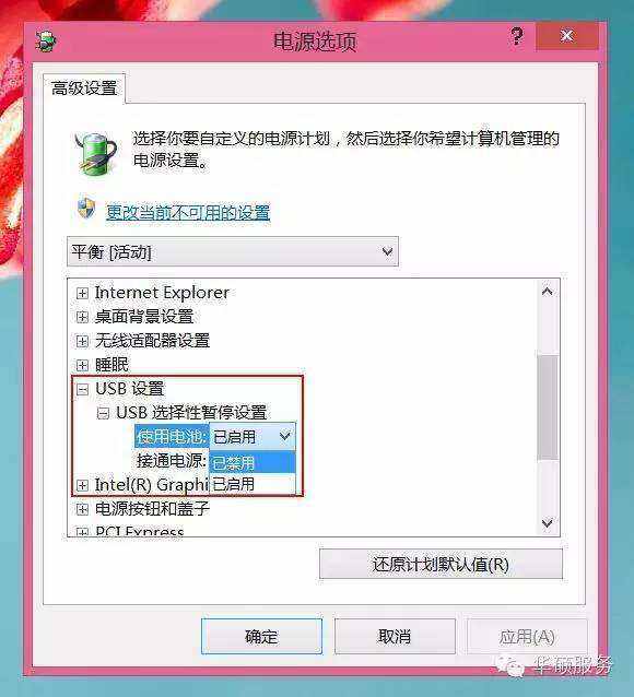 进入电源选项,单击当前所选的计划边的更改计划设置,单击更改高级电源设置,单机框中展开USB设置,然后展开USB选择性暂停的设置,然后选择禁用。