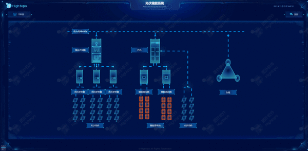 监测运行的储能设备以及实时功率,结合后台数据的实时更新,形成知识库,需要时释放储存能量。Hightopo轻量化模型搭建的光伏储能监测场景。结合光伏发电原理与储能模型,对太阳电池板(组件)、控制器和逆变器三大部分以逻辑图形式呈现,帮助管理人员理清光伏发电运作脉络。从而对输出能量平衡调节,全面分析,保障光伏供电可靠性,提升阴雨天停电事故的应急效率。