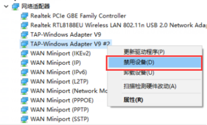 打开控制面板-设备管理器-网络适配器 ,将TAP-Windows Adapter V9等类似网络适配器全部禁用