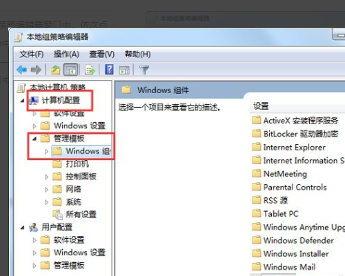 4、在打开的组策略编辑器窗口中,依次点击展开左侧菜单中的【计算机配置】——【管理模板】——【 windows组件】,之后,在左侧窗口中找到windows media player项并展开。