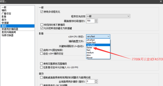 3、最后来到高级设置,在x264 cpu预设下拉框中选择veryfast模式,如果是7700k可以尝试faster。