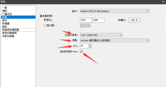 2、接着切换到影像功能,把压缩分辨率设置成1.50,滤镜选择lanczos,giant路径对画面的细节处理效果做好,看着也会更加清晰。FPS调整到60,把启动停用aero的小勾选中。